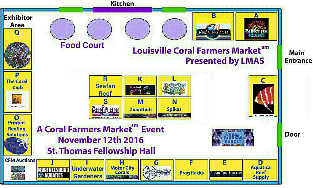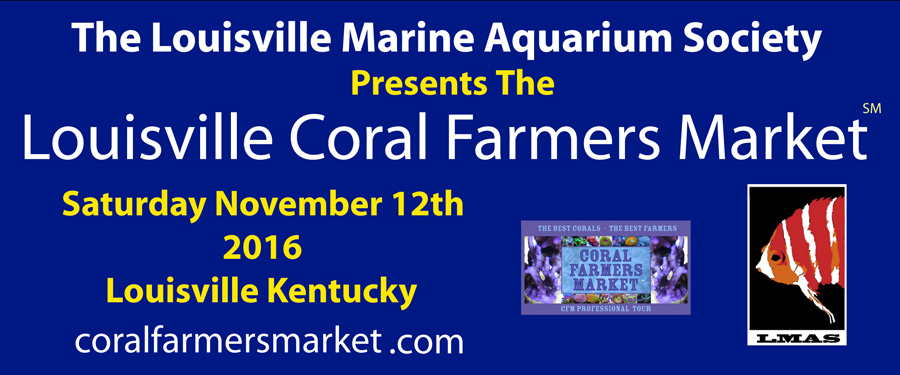 Vendor Hall Open to Public Saturday 11/12 [Noon - 5:00 PM]Once again the Louisville Marine Aquarium Society (LMAS) presents the Louisville Coral Farmers MarketSM coral show. This event on November 12th 2016 is our second Louisville event. Last year we had a good turnout even though a nasty snowstorm was hitting up north. This 2016 event will feature a wide selection of aquarium reef corals, excellent food at a good price, some exhibitors with exciting products and a club sponsored raffle. Attendees will find a friendly atmosphere for coral enthusiasts just a couple of weeks before the holiday season begins. All of our coral selling booths are SOLD OUT. We have an exhibitor area next to the food court and we have room for one more exhibitor. For exhibitor booth inquires send email to coralfarmersmarket@gmail.com