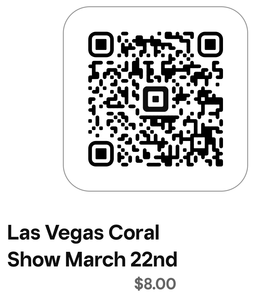 Attendance tickets for the Las Vegas Coral Show are available for online purchase. Price is $8 each. Use the link below or the QR code. Children 12 and under are free. All online ticket purchases will be held for pickup at the door the day of the event.