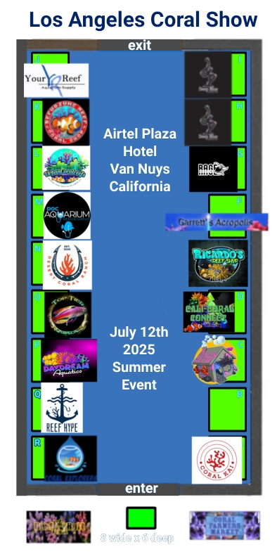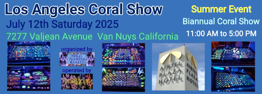 The Coral Farmers MarketSM company and coorganizer Reef Raft USA, are bringing our fifth biannual cohosted coral show to Los Angeles. The Los Angeles Coral Show Summer will occur on Saturday July 12th 2025. This will be held at our hotel venue near the Van Nuys airport. Located right in the heart of the San Fernando Valley. This event will feature coral vendors, parking near the hotel, safe distanced environment, more coral than can be counted and door prizes for early online ticket buyers. The LACS 2025 Summer event will be organized by Steve Tyree of CFM and operated by Tony Huynh of RR USA. For vendor inquiries contact coralfarmersmarket@gmail.com