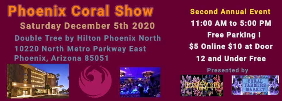 The Coral Farmers MarketSM company and the Reef Raft USA company are operating a second annual Phoenix Coral ShowSM event occuring on December 5th 2020. This coral show event will be open to the public between 11 am to 5 pm on Saturday December 5th. The location is the same 2019 hotel ballroom in north Phoenix. Parking is free for attendees. There will be a few thousand captive grown and cultured coral fragments available. From beginner corals to advanced and collector corals. This event will be hosted by Steve Tyree. We are only talking booth reservations in private. A vendor waiting list is being constructed. Please contact coralfarmersmarket@gmail.com to be placed on the list.
