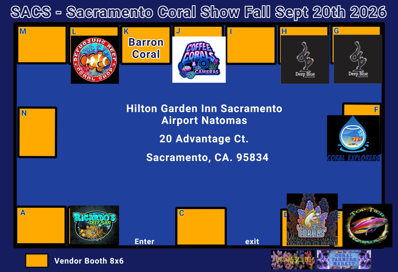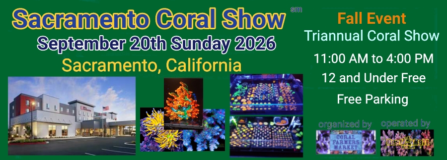 The Coral Farmers MarketSM company and Reef Raft USA, are bringing our seventh coral show to Sacramento California. The Sacramento Coral Show Spring will occur on Sunday September 20th 2026. This will be held at a Hilton Garden Inn hotel venue near the airport. This event will feature coral vendors, awesome exhibitors, plenty of parking, more coral than can be counted and door prizes for early online ticket buyers. The SACS 2026 Fall event will be organized by Steve Tyree of CFM and operated by Tony Huynh of RR USA. For vendor inquiries contact coralfarmersmarket@gmail.com