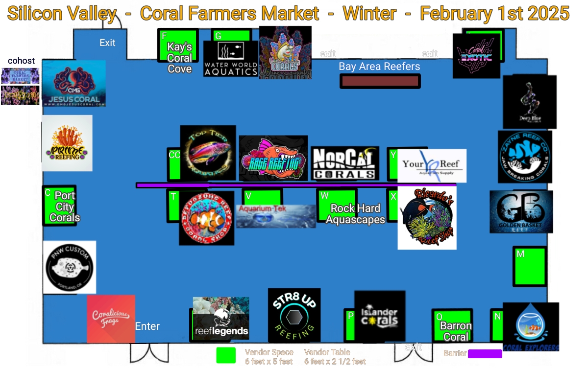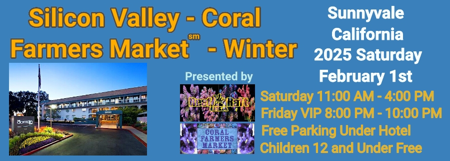 The Coral Farmers Market company, along with coorganizer Reef Raft USA, are hosting our 20th tri-annual Silicon Valley Coral Farmers Market event on February 1st 2025. Our Northern California Bay Area coral show will be open to the public between 11 am - 4 pm on Saturday February 1st. We will also be open to VIPs Only Friday night 8 PM to 10 PM January 31st. Parking at this venue is free for attendees and is located under the venue. This will be the first event for our triannual schedule in the Bay Area of Nor Cal. The second event is in May, while the third event is in September. Vendor booths are being filled. Send vendor email inquiries to coralfarmersmarket@gmail.com