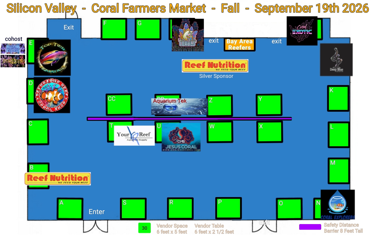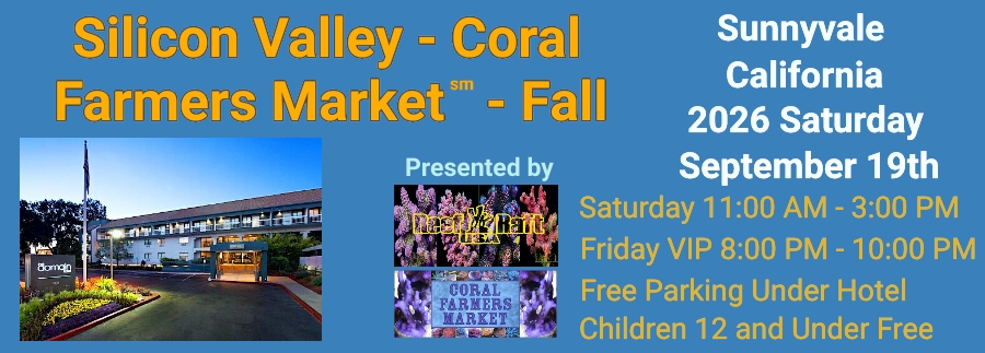 The Coral Farmers Market company, along with coorganizer Reef Raft USA, are hosting our 21st tri-annual Silicon Valley Coral Farmers Market event on September 19th 2026. Our Northern California Bay Area coral show will be open to the public between 11 am - 4 pm on Saturday September 19th. We will also be open to VIPs Only Friday night 8 PM to 10 PM September 18th. Parking at this venue is free for attendees and is located under the venue. Vendor booths are being filled. Send vendor email inquiries to coralfarmersmarket@gmail.com