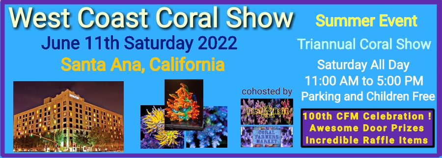 The Coral Farmers MarketSM company and coorganizer Reef Raft USA, are bringing our eighth triannual coral show to Southern California. The West Coast Coral Show Winter will occur on Saturday June 11th 2022. This will be held at our Santa Ana hotel venue. We are also celebrating the 100th hosted or cohosted coral show event by the Coral Farmers Market company. We have ramped up the raffle items for this event. See the table below for some of the prizes. Join us at the very first event officially called a Coral Show within the US. This event will feature coral vendors, plenty of free self parking, safe distanced environment, easy freeway access, more coral than can be counted and door prizes for early online ticket buyers. The WCCS 2022 Summer event will be organized by Steve Tyree of CFM and operated by Tony Huynh of RR USA. We are just now selling booths. For vendor inquiries contact coralfarmersmarket@gmail.com
