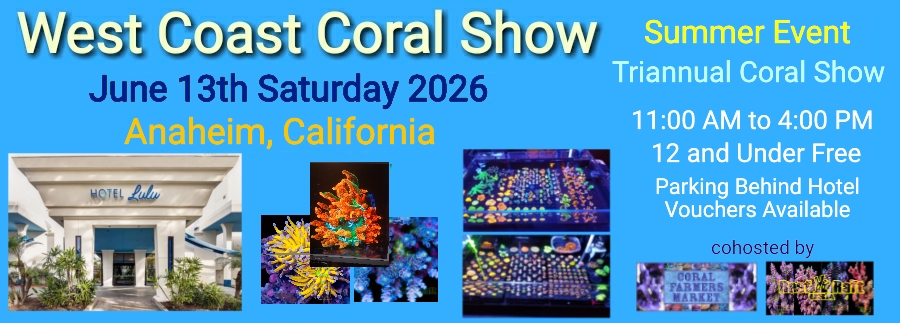 The Coral Farmers MarketSM company and show operator Reef Raft USA, are bringing our 20th triannual coral show to Southern California. The West Coast Coral Show Summer will occur on Saturday June 13th 2026. This will be held at our Anaheim hotel venue. Join us at the very first event officially called a Coral Show within the US. This event will feature coral vendors, awesome exhibitors, plenty of validated parking, a safe environment, more coral than can be counted and door prizes for early online ticket buyers. The WCCS 2026 Summer event will be organized by Steve Tyree of CFM and operated by Tony Huynh of RR USA. For vendor inquiries contact coralfarmersmarket@gmail.com