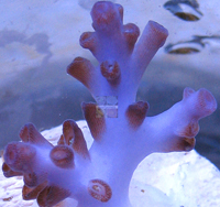 Blue Monster Acropora Future LE Bright Baby Blue Branch Stems Corallites Dark Purple Colored Corallite Polyps Example Fragment Imaged Image copyright Reeffarmers Strong to Moderate Light Moderate to Weak Current Difficult to Maintain Stony Coral Raffle for Small Fragment