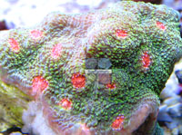 Bubble Gum Monster Chalice LE Bright Pink Corallite Centers Surface Slightly Bluish Bright Green Spots over Surface Example Seed Colony Imaged Image copyright Reeffarmers Weak to Moderate Light Moderate Water Current Moderately Difficult to Maintain Raffle for Small One Eye Fragment