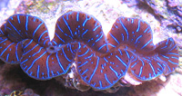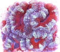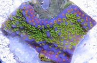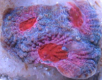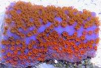 Rainbow Delight Chalice LE Orange and Red Corallite Centers Surface Colored Red Growth Edge Purple Blue Example Seed Colony Imaged Image copyright Reeffarmers Weak to Moderate Light Moderate Water Current Moderately Difficult to Maintain Raffle for 3 Eye Fragment