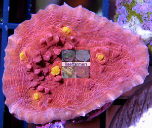 Cotton Candy Alien Eye Chalice Pink Red Corallite Eyes Bluish Base Pigmentation Also called Raspberry Monster Example Two Corallite Fragment Imaged Image copyright Reeffarmers Weak to Moderate Light Moderate Water Current Moderately Difficult to Maintain Stony Coral Raffle for Two Corallites