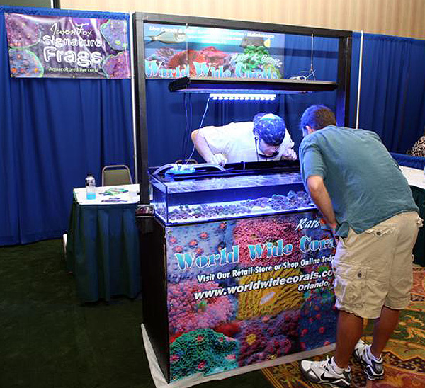 We experienced an incredible amount of participation in our first ever Florida based Coral Farmers Market SM 2010 event. The South Eastern Coral Farmers Market SM was also our first east coast coral show. Thanks to all the participants who made the 2010 SE-CFM May 23rd coral show our best ever first year event. The vendor participation was strong. Public attendance was our highest ever for a first year event. Total attendance including vendors but not staff was 355. The public was very excited to see the captive grown and cultured corals that were offered for sale. Vendors were pleased with the economic activity that was generated during the show. The corals that were available were also very healthy. Images of almost all the actual coral displays can be seen below. Operationally the event was completely flawless. Our Golden Sponsor World Wide Corals provided some valuable logistical support. They not only provided all our saltwater requirements, but WWC even housed corals flown in by some of our vendors. These corals were in excellent condition at the coral show event. Reef Nutrition another one of our Golden Sponsors also continued their support for our Coral Farmers Market SM events. Thanks to all the vendors that assisted with the setup of our pipe and drape infrastructure on Saturday night. The Orlando Reef Caretakers Association (ORCA) also provided assistance with setting up and tearing down our coral show equipment. Overall the CFM staff experienced some fine southern hospitality during our visit to Florida. We definitely will make this an annual event that always occurs some time during the second quarter every calendar year. Thanks to everyone who helped to make this event a very successful coral show.