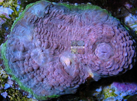 Mayan Sun Favia Limited Edition Stony Coral Solid Red Corallite Center Radiating Fluorescent Green Stripes Wet Thumb Frags Original Example Corallite Imaged Image copyright Reeffarmers Weak to Moderate Light Moderate Water Current Auction for Single Corallite