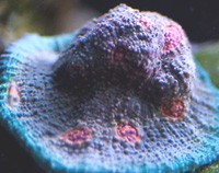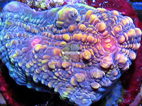 Avatar Chalice Stony LE Evaluation Coral Pink Spotted Corallite Centers Green Yellow Spotted Lines Bluish Base Pigments Wet Thumb Frags Original Reeffarmers Seed Imaged Image copyright Reeffarmers Weak to Moderate Light Moderate Water Current Auction for Corallite from Seed