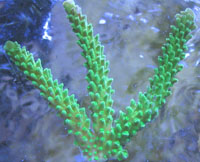 Acropora sp. Lime in the Sky Limited Edition Typical Closeup Image Fragment made from parent Size = 1 inch tall Difficult to Maintain Exotic Acro