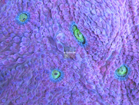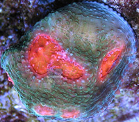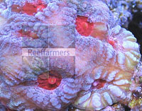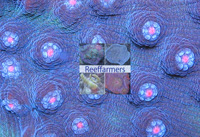 Eye of Jupiter Favia Amazing Pigmentation Pattern Auctioned Edition Coral Seed Colony Imaged Originally from SniperSPS Fragment from Seed Low Light Moderate Current Moderately Difficult to Maintain Image copyright Reeffarmers Approximate Size = 1/2 x 1/2 inch