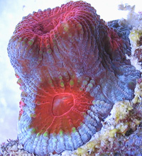 Triple Threat Favia Limited Edition DA-CFM Logo Coral Red Corallite Centers Sky Blue Ridges between Corallites Encrusting Massive Stony Weak Light Moderate Current Moderately Difficult to Maintain Example Seed Colony Auction for Small Fragment from Seed