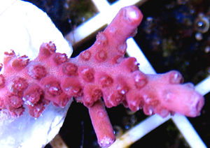 Blue Monster Acropora New Limted Edition First Edition Limited Edition Baby Blue Cream Branches Dark Purple Corallites Polyps also Pigmented Blue Moderate to Strong Light Moderate to Weak Current Moderately Difficult to Maintain Actual First Edition Fragment Imaged Size = 1 inch Tall Fragment |