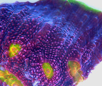 Golden Chalice Wet Thumb Frags New Limited Edition First Edition Bright Golden Surface Pigmentation Purple Splotches Around Corallite Inner Corallite Ringed Blue and Violet Image Copyright Reeffarmers Auction for Actual Corallite Imaged Weak to Moderate Light Moderate Water Current Moderately Difficult to Maintain