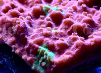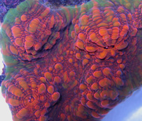 Chicken Pox Favia AE Coral Second Edition Auctioned Edition Solid Red Orange Large Corallites Surface is Blue to Turquiose Grows Well in Captivity Easy to Maintain Weak Light Moderate Current Example Corallite Seed Auction for a Singe Large Corallite