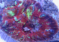 Delirium Favia New Exclusive Edition Favia Brilliant Fluorescent Red Surface Electric Green and Gold Patterns Difficult to Maintain Weak to Very Weak Light Weak to Moderate Current A Rocky Mountain Frags Original Actual First Edition Fragment Imaged Auction for a Multi Corallite Fragment
