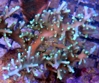OA Green Leviathan Acropora Future Limited Edition Acropora Auction for First Edition Fragment Bright Lime Green Branch and Corallite Tips Similar to Original Green Leviathan LE OA Version has additional Turquoise Blue Difficult to Maintain Moderate to Weak Light Weak to Moderate Current An Oculus Aquatics Original Original Seed Colony Imaged Auction for Small Frag from Seed Single Branch Fragment