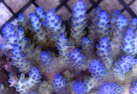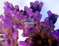 RR Tricolor Acropora New Limited Edition Stony Reddish Purple Version of the Acro Tricolor Almost a Solid Purple Coloration Polyps Fluoresce Green Moderately Difficult to Maintain Strong to Moderate Light Moderate Water Current An Reef Raft USA Original Seed Coral Colony Imaged Auction for a Small Frag from Seed Single Branch Fragment