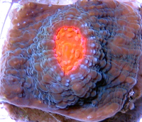 RR Colossus Chalice New Limited Edition Stony Chalice Large Brilliant Orange Corallites Eyes Swirl of Orange, Green, Yellow Surface has Bright Blue Spots Moderately Difficult to Maintain Weak to Moderate Light Weak Water Current An Reef Raft USA Original Actual Fragment Imaged Auction for a Small Fragment Single Eye Fragment