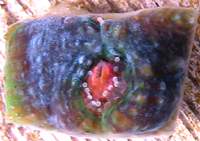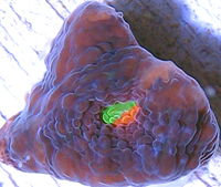 RR Volcano Chalice New Limited Edition Stony Chalice Brilliant Orange and Green Patched Eyes Distinct Pigment Patches do not Swirl Dark Maroon Surface with Green Patches Moderately Difficult to Maintain Weak to Moderate Light Weak Water Current An Reef Raft USA Original Actual Fragment Imaged Auction for a Small Fragment Single Eye Fragment
