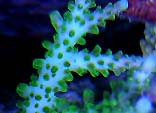 Acropora sp. Lime in the Sky Limited Edition Coral Green Tips and Corallite Ridges Blue Colored Branch Stems Moderate to Strong Light Weak Current Difficult to Maintain Exotic Acro Image Copyright Greg Carroll Fragment made from Seed Size = 1/2 Inch Encrusting