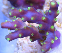 Bali Tricolor Acropora Limited Edition Stony Coral Purple with Intense Green Polyps Example Fragment Imaged Requires Moderate to Strong Light Requires Moderate to Weak Current Moderately Difficult to Maintain Stony Coral