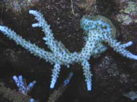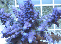Jesus Echinata Acropora Super Exotic Slow Grower Intense Solid Blue Polyps are Bright Turquoise 3rd Edition Auctioned Edition Strong Light Moderate Current Difficult to Maintain Seed Colony shown in Image Fragment from Seed Colony Size = 1/2 inch Tall Fragment |