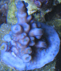 Blue Tipped Montipora Exotic Blue Tipped Polyps Can Turn Solid Blue in Intense Light Limited Edition Example Fragment Imaged Moderate Difficulty Strong to Moderate Light Coral Fragment is 5/8 inch in diameter