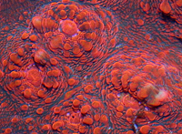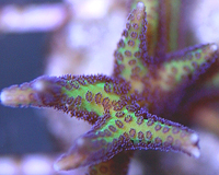 Miami Hurricane Chalice Auctioned Edition Stony Coral Turquoise Blue Base Pigments Bright Orange Corallite Eyes Example Seed Colony Imaged Prefers Weak Light Moderate Current Easy to Maintain Stony Coral DA-CFM Website Background Coral Raffle for Small Fragment 2 Eyes